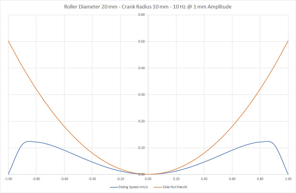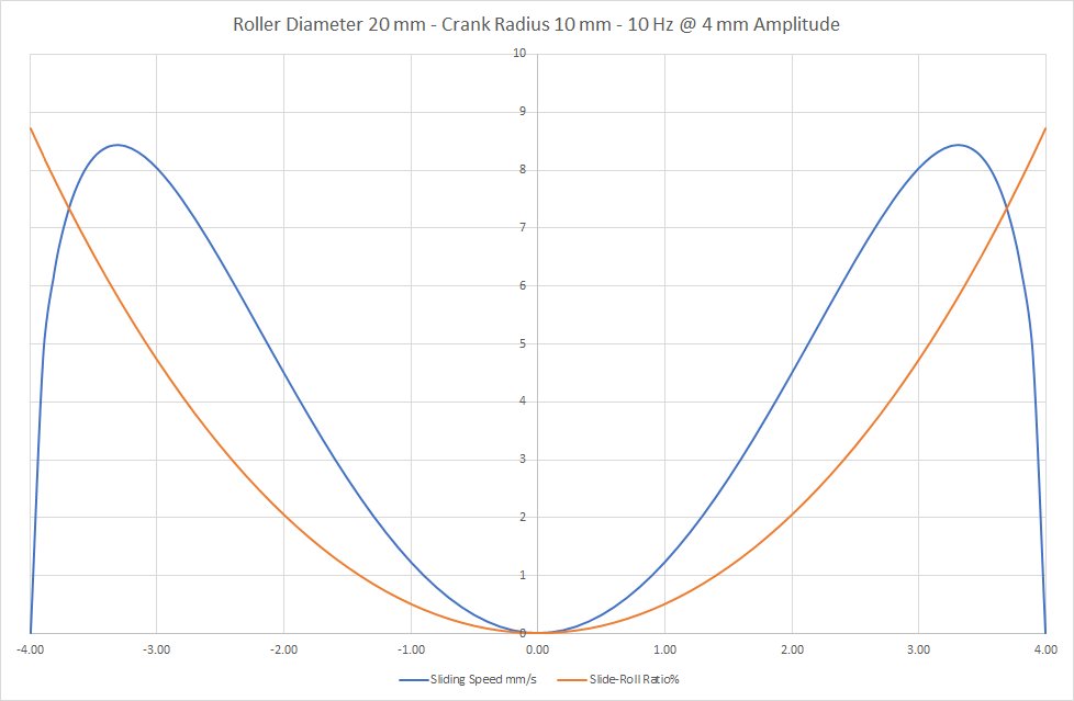 With Disc Radius (Rd) = Crank radius (Rc) = 10 mm, the slide-roll ratio and sliding speed vary with stroke position as shown below: