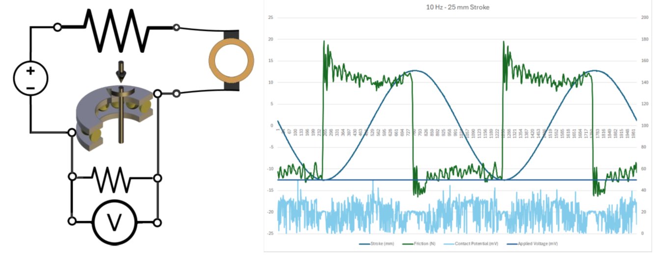 The moving specimen carrier is electrically isolated contact resistance measurement using a Lunn-Furey circuit. This is a high ratio potential divider with the tribo-contact acting as an electrical switch, in parallel with the low resistance side of the potential divider, with the resulting voltage being measured. The voltage across the tribo-contact is typically set to a maximum of between 20 and 50 mV.